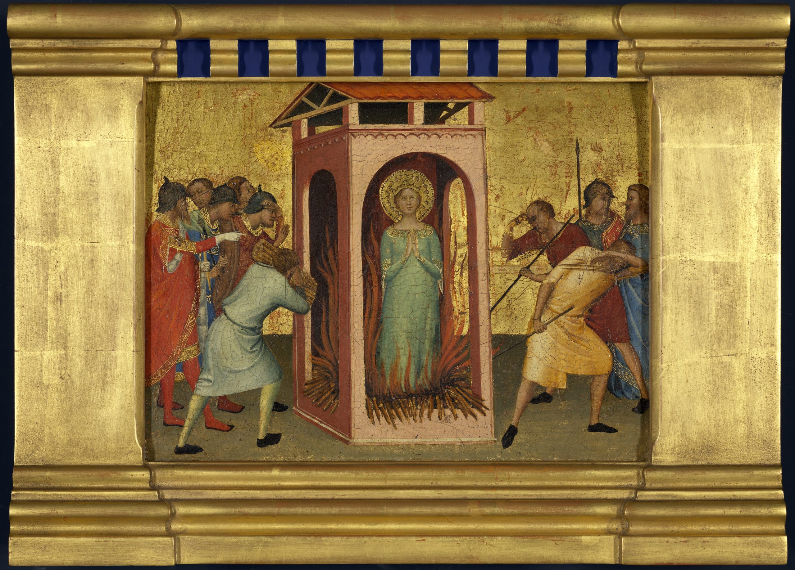 Für den Florentiner Dom schuf der Maler Bernardo Daddi um 1340 ein imposantes, mehrteiliges Altarbild. Das Zentrum bildete eine große Darstellung der thronenden Muttergottes mit Kind. Im unteren Teil der Sockelzone (Predella) zeigten acht kleine Gemälde die Legende der hl. Reparata. Leider wurde dieser Zyklus verstreut: Zwei Bilder sind verschollen, eines befindet sich in Privatbesitz, fünf werden von Museen (New York, Dresden, Köln) aufbewahrt. Kürzlich haben wir unser Bild restauriert. Die alten Kratzer auf den Folterknechten wurden belassen. Doch haben wir die Tafel nach historischen Vorbildern neu rahmen lassen – quasi als herausgeschnittenen Teil einer Predella.
