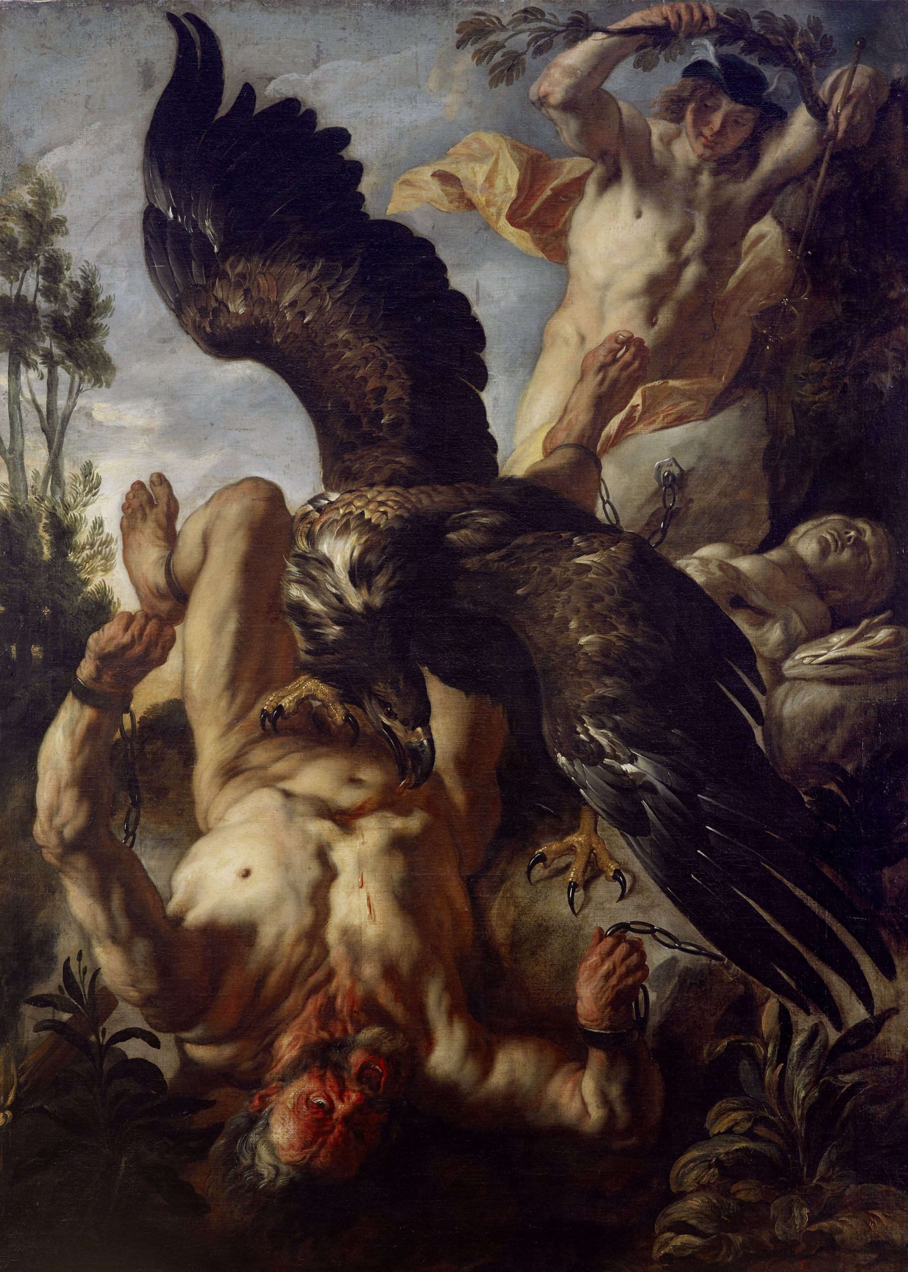 Höllischer Schmerz verzerrt das Gesicht des Prometheus. Sein Körper stürzt uns aus dem monumentalen Hochformat geradezu entgegen. Ein Adler mit ausgebreiteten Schwingen frisst dem Unglücklichen die Leber aus dem Leib: göttliche Strafe für den Raub des Feuers, den die Fackel links vorne bezeugt. Von rechts oben beobachtet der Götterbote Merkur mit mildem Lächeln die grausame Szene.