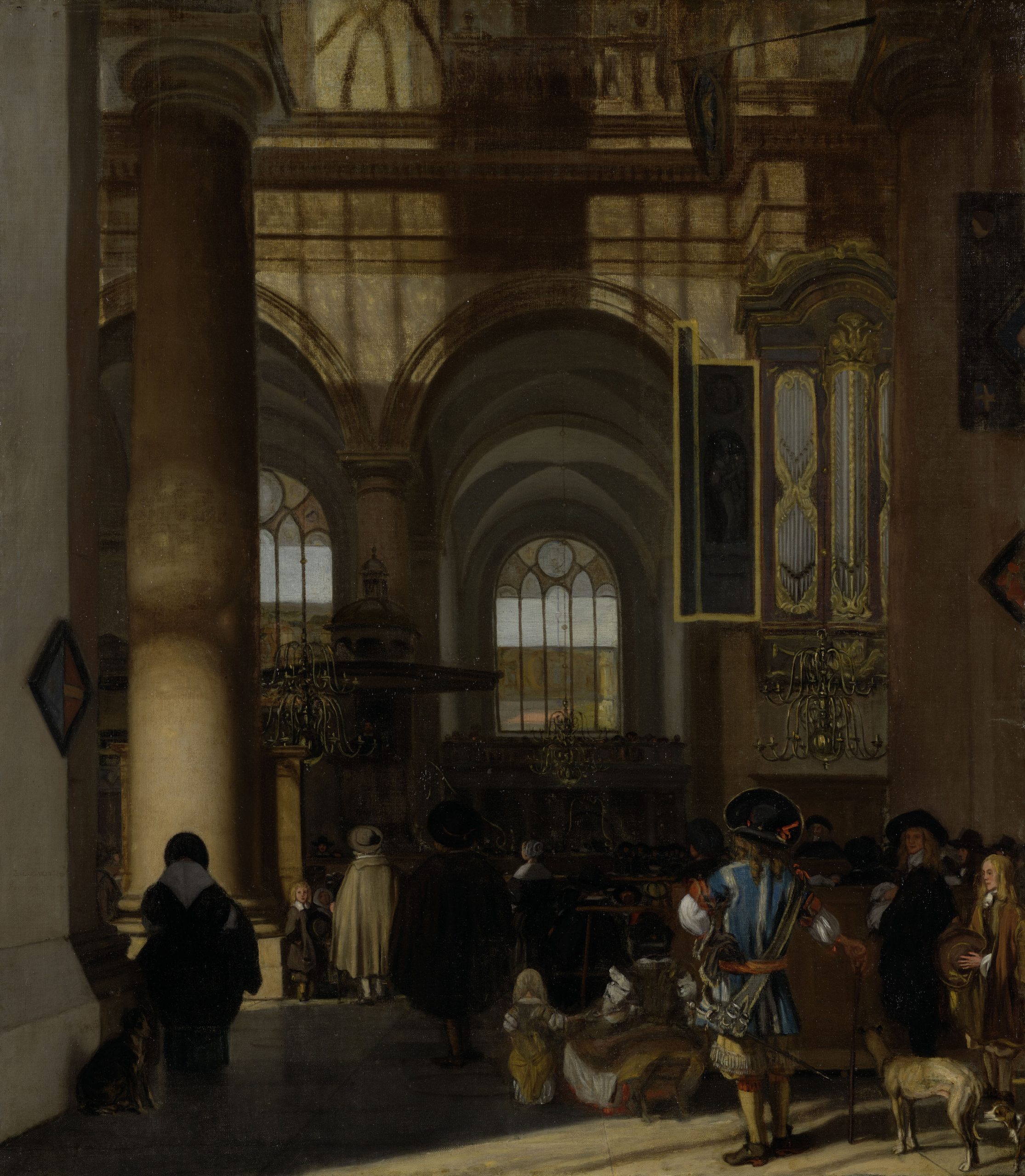 Das Betreten eines Kirchenraums weckt immer besondere Gefühle. So auch auf diesem Bild: Die hohen Säulen und das gedämpfte Licht verbreiten eine weihevolle Stimmung. Man glaubt förmlich die Klänge der Orgel und das Murmeln der betenden Gemeinde zu hören. Die Kanzel mit dem Prediger liegt im Dunkel. Dennoch ist er Fixpunkt des Geschehens. Auf ihn sind die Rückenfiguren der Gemeinde ausgerichtet. Nur zwei Teilnehmer bemerken unsere Anwesenheit und blicken uns an. Das Spiel des Lichtes, das durch die Kirchenfenster einfällt, seine Schatten und Reflexionen, waren eine Spezialität des Malers.