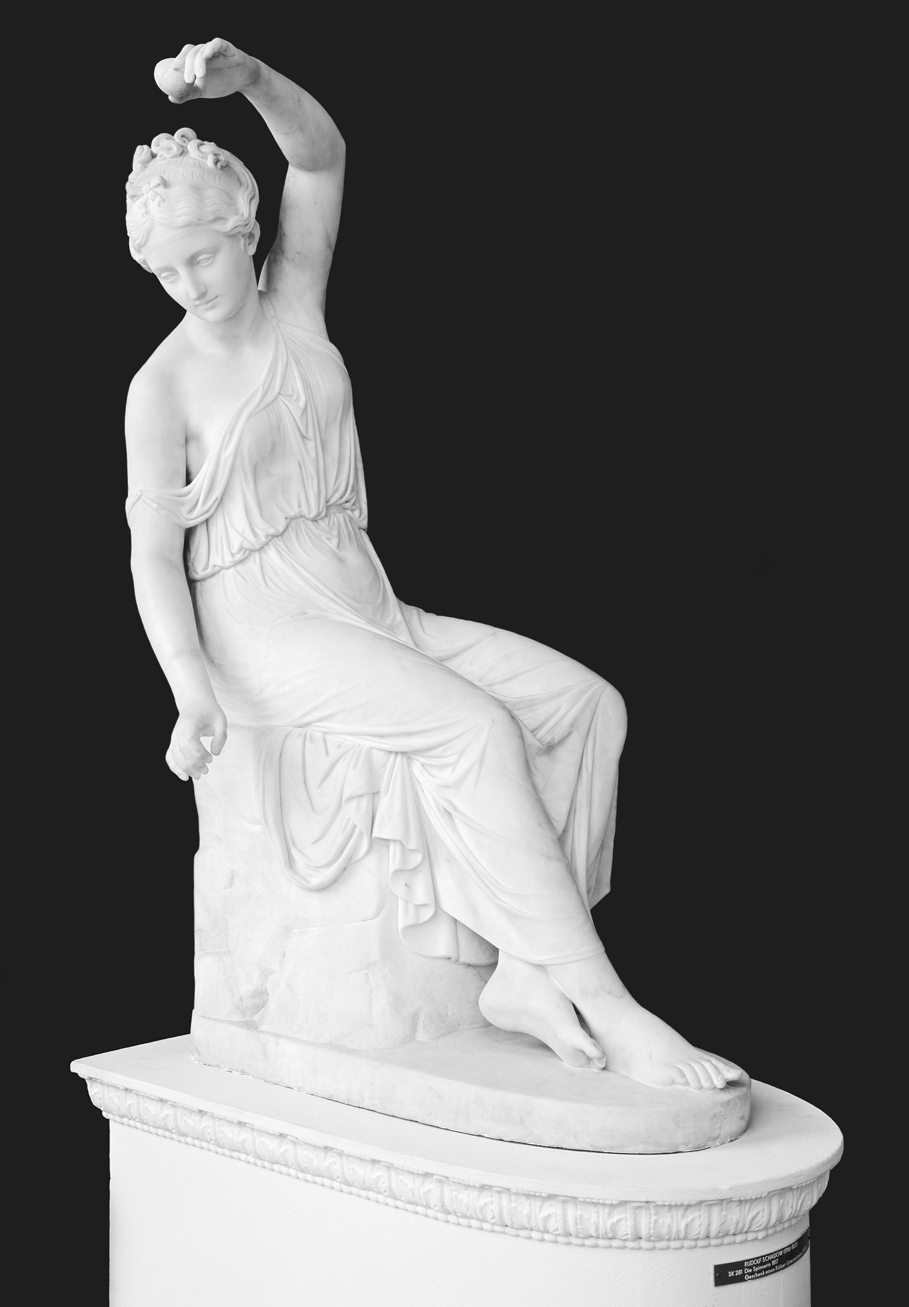 Die anmutige Figur in antikem Gewand stammt von der Hand des talentierten Sohnes. Er verbindet die klassische Kunst mit romantischen Ideen: Erspüren Sie die stille Versunkenheit, in der die Spinnerin sanft einen unsichtbaren Faden von ihrer einen in die andere Hand überführt. Fast lieblich ist das Bildwerk Rudolf Schadows, der auch der Lyriker unter den klassizistischen Bildhauern genannt wird.