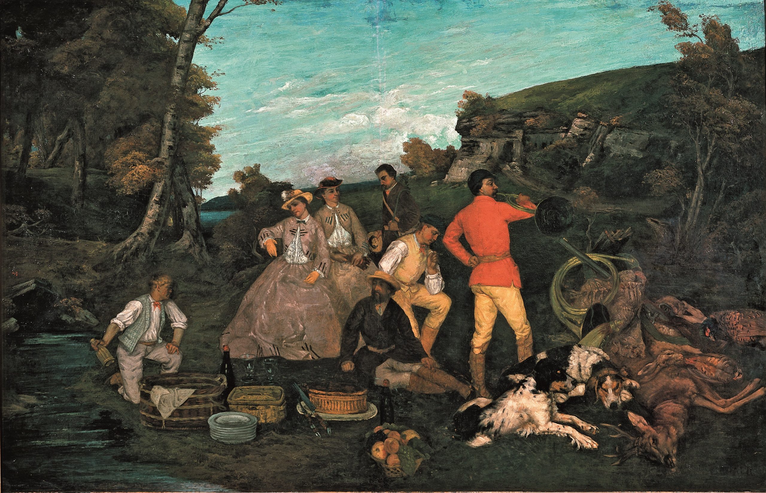 Courbet war der Revolutionär unter den Malern, nicht nur stilistisch, sondern auch als politischer Aktivist. Hier sehen wir ihn in der Mitte einer Jagdgesellschaft sitzend. Das Privileg der Jagd hatten sich die bürgerlichen Kreise erst kurze Zeit zuvor erstritten.