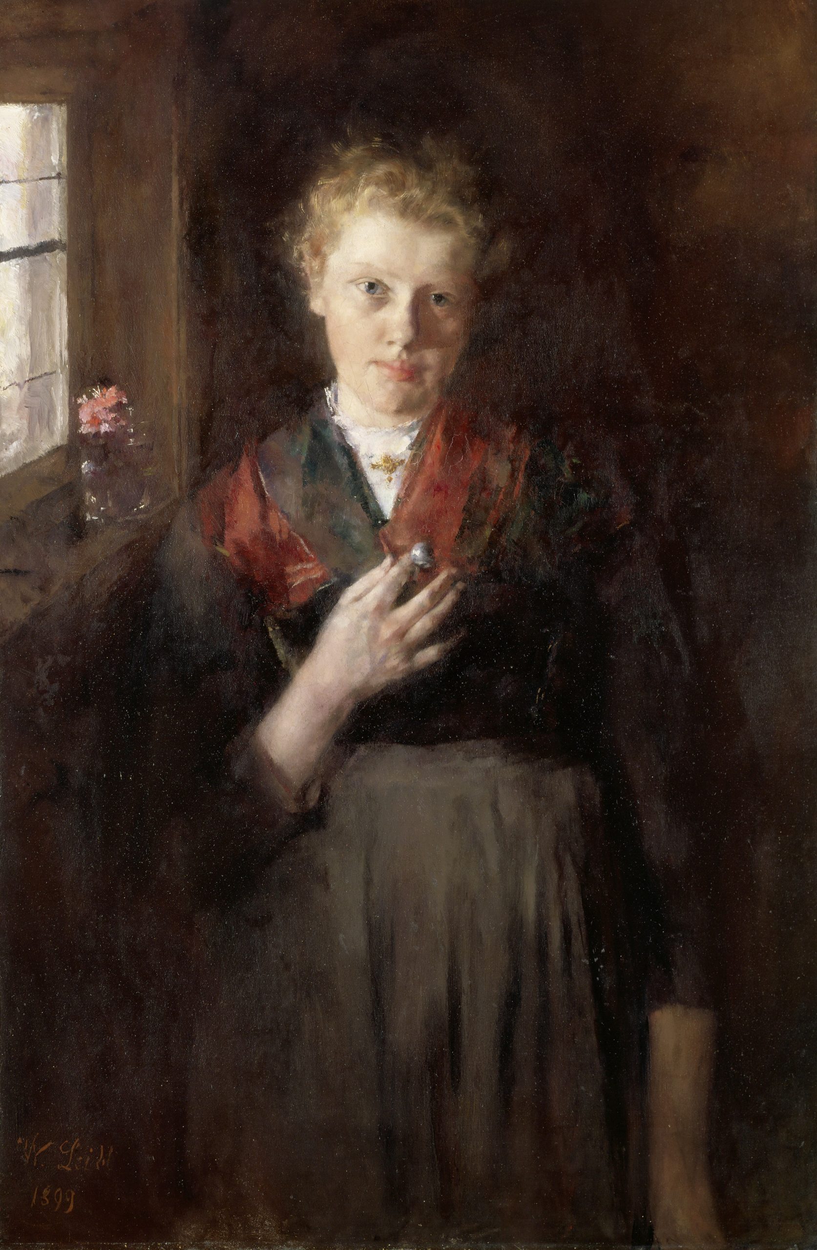 Am 11. Oktober 1898 schrieb Leibl einem Sammler voller Begeisterung: »Ich habe jetzt ein Modell, welches außerordentlich malerisch ist und in dem Interieur oben […] geradezu phänomenal aussieht. Ich werde dort wahrscheinlich ein lebensgroßes Kniestück malen. Die Person hat rötliches Haar und sieht mit einem farbigen Tuch brillant wie Gold aus. Ich möchte das ganz vollendet und gustios malen und einmal die Feinheit auf die Spitze treiben, soweit ich kann.« Für das großformatige Bild brauchte der sonst noch viel langsamer arbeitende Maler etwa ein halbes Jahr. Offensichtlich beflügelte ihn seine Begeisterung für die Schönheit des Modells und das »Magische« der Lichtverhältnisse.