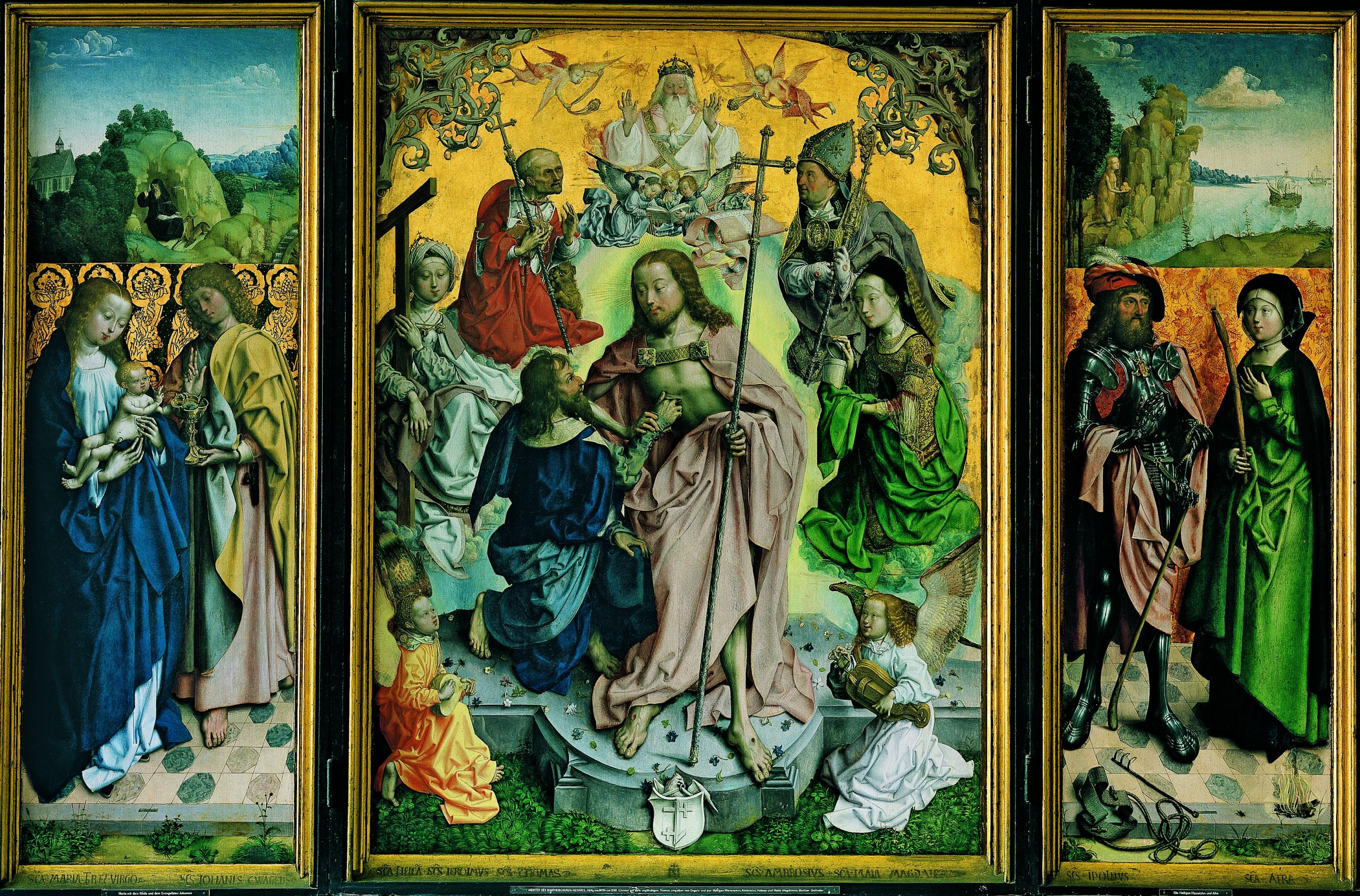 Wie ein Gerichtsmediziner schiebt der ungläubige Thomas seine Finger in die Seitenwunde des auferstandenen Christus. Überwältigt von Engelsmusik, Blumen- und Weihrauchduft erblickt der bekehrte Zweifler die Herrlichkeit Gottes: ein schöner Vorwand, um die Heiligen darzustellen, denen der Altar geweiht war. Wie Bilder im Bild wirken die Landschaften mit den Heiligen Aegidius und Maria Aegyptiaca. Die Darstellung der »wilden« Maria Aegyptiaca und der drei auf sie zu segelnden Schiffe (rechts oben) ist ein frühes künstlerisches Echo auf die »Entdeckung Amerikas«. Zurück in den Mikrokosmos des Alltags führt die Fliege (rechts unten), die »pointillistische« Spuren hinterlässt: auf der gemalten Steinstufe oder dem Bild selbst?