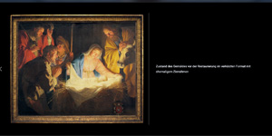the nocturne with lifesize half-length figures – eminently suited to depicting the miracle of the Holy Night. The child is the sole light source. His radiance illuminates the faces of Mary, Joseph and the shepherds, evoking intimate emotions: the quiet bliss of the parents, the joyful awe and humble reverence of the shepherds. The scene is also witnessed by an ox, lovingly warming the child with his breath in the cold night air.